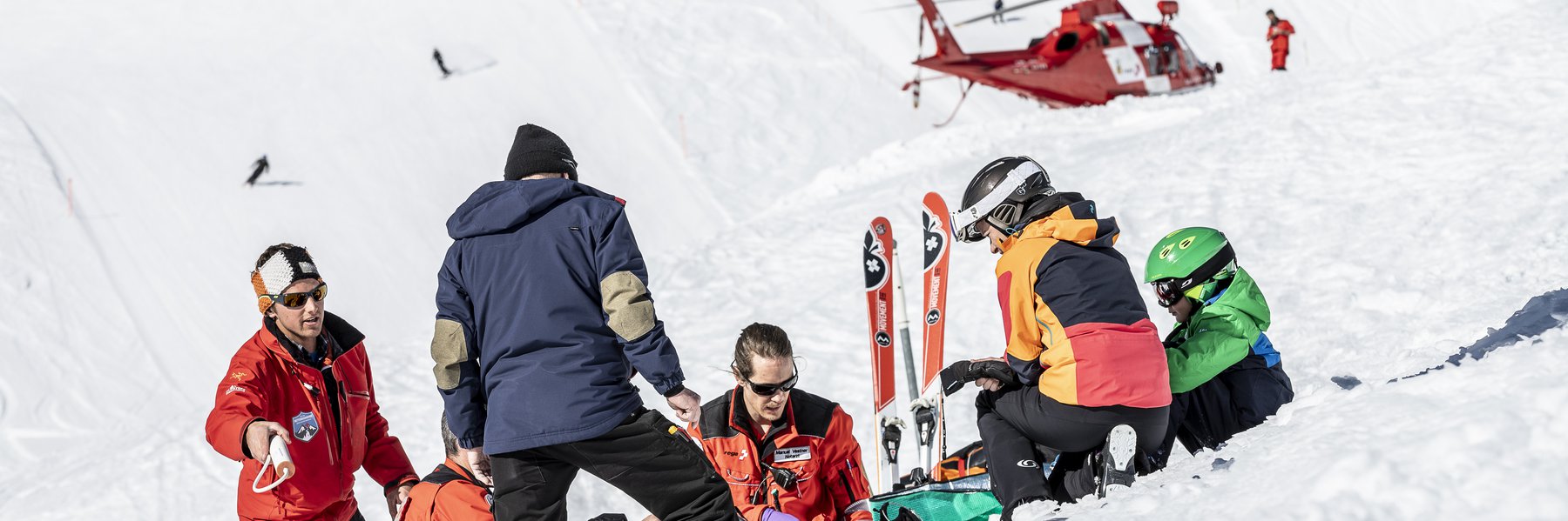 Mit dem Schlitten ins Tal oder bei schwereren Unfällen mit der Rega direkt ins Spital? Dieser Entscheid obliegt im Regelfall den Pistenrettern des jeweiligen Skigebiets. Auch wenn grundsätzlich jeder rund um die Uhr die Rega direkt alarmieren kann, macht es bei den meisten Unfällen auf Pisten Sinn, zuerst den lokalen Pistenrettungsdienst zu Hilfe zu rufen. Die Nummer finden Sie jeweils auf Ihrem Skipass. Die Pistenpatrouilleure sind im Umgang mit medizinischen Notfällen ausgebildet, kennen die Örtlichkeiten und sind in der Zusammenarbeit mit den Rega-Crews geschult – wissen also um die Möglichkeiten und Grenzen des Rettungshelikopters.
