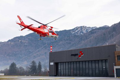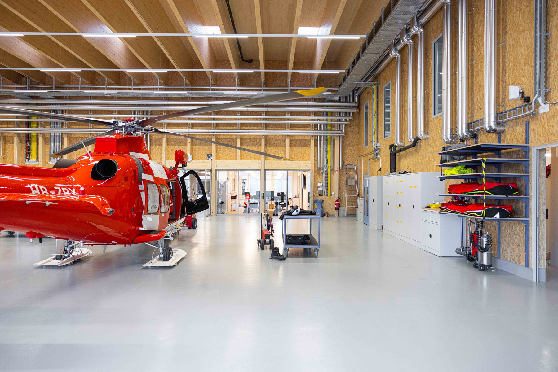 Die Basis besteht aus 213 vorgefertigten Elementen und insgesamt 406 Kubikmetern Schweizer Holz. Beton kommt nur dort zum Einsatz, wo Stabilität zwingend notwendig ist, etwa beim Hangar-Portal und aus Brandschutzgründen bei der Helikopter-Tankstelle. Der Neubau in Holzbauweise setzt bautechnisch Massstäbe für künftige Infrastrukturprojekte, wie die neue Helikopterbasis in Samedan (GR). Auch sie wird als Holzbau realisiert werden – ressourcenschonend, klimafreundlich und mit Fokus auf regionale Anbieter.