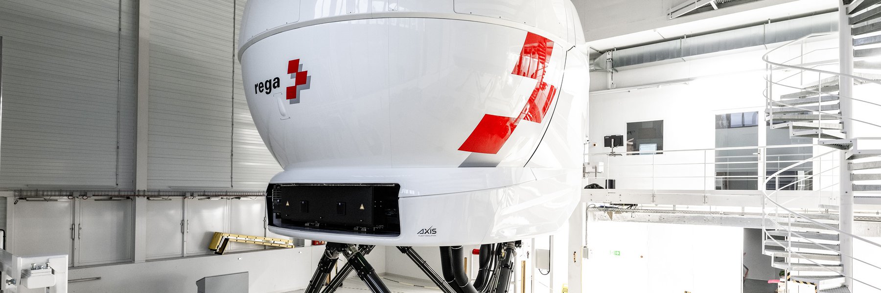 Der Helikoptersimulator ist ein Full-Flight-Simulator der höchsten Zertifizierungsstufe, der über ein sogenanntes «Roll-on/Roll-off»-System verfügt. Damit können auf derselben Bewegungsplattform Cockpits unterschiedlicher Helikoptertypen eingesetzt werden. Neben dem H145 hat die Rega ein Airbus-H125-Cockpit gemeinsam mit der Swiss Helicopter AG beschafft. Lufthansa Aviation Training (LAT) betreibt die Simulatoren und bietet freie Kapazitäten auch Drittkunden an.