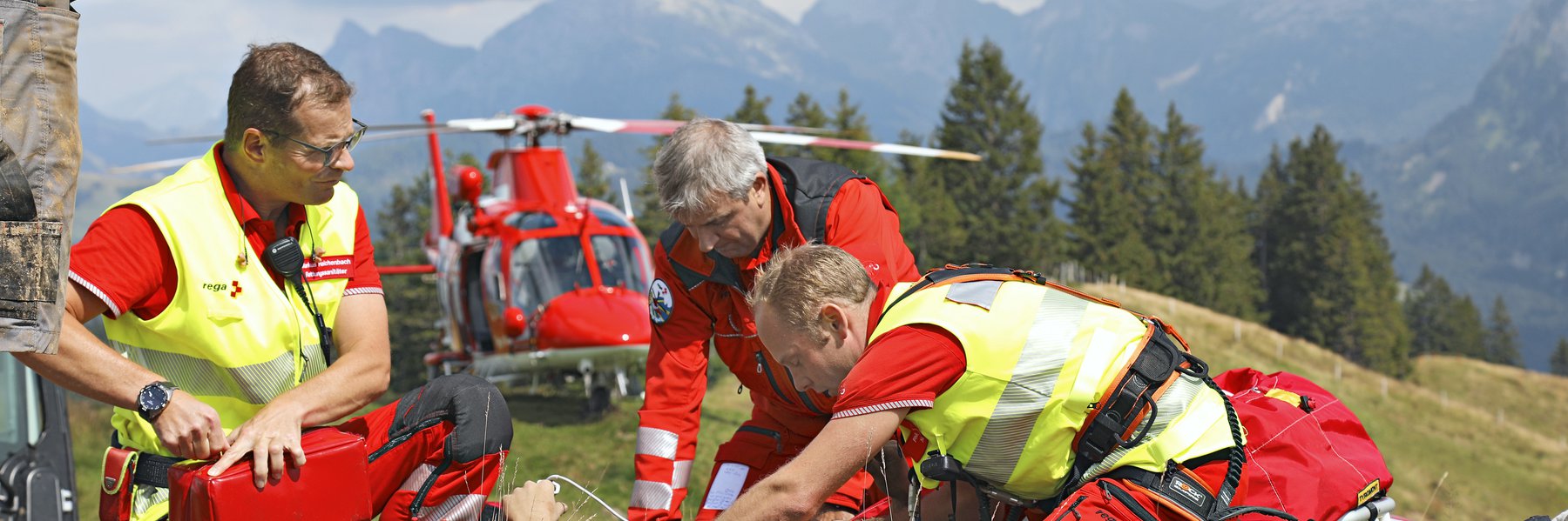 Survolant en quelques minutes les imposants sommets alpins de Glaris et de Schwyz ainsi que le Wägitalersee, l’hélicoptère de sauvetage a tôt fait de rejoindre le lieu de l’accident, situé à proximité d’un alpage à environ 1’500 m d’altitude. Isolé, à bonne distance du réseau routier, le site aurait été très difficile à atteindre en véhicule de sauvetage au sol. En particulier lorsque l’accès ou l’évacuation s’avère complexe en terrain peu praticable, l’hélicoptère de sauvetage est de loin le moyen de transport le plus rapide et sans heurts pour les patients. Les pales du rotor de l’hélicoptère qui vient de se poser tournent encore que Philipp Stein et Markus Reichenbach se dirigent déjà à grands pas, sac à l’épaule, vers la victime entourée de plusieurs personnes. Ils la trouvent couchée sur le dos, à côté du grand fossé qui a failli lui être fatal en cet après-midi ensoleillé.