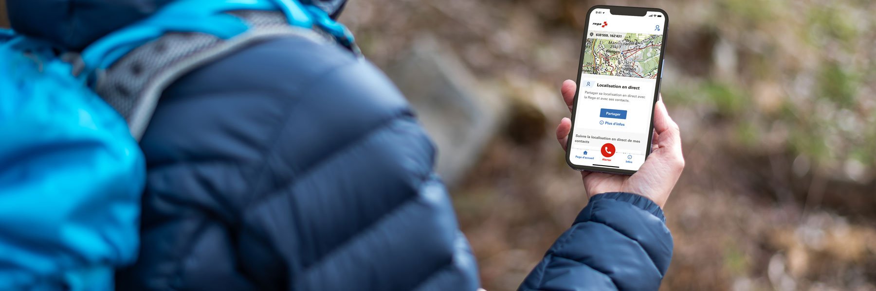 L’application Rega vous permet d’alerter la centrale d’intervention de la Rega, qui recevra automatiquement votre géolocalisation. En outre, vous pouvez partager votre position actuelle avec la Rega et /ou vos contacts pour permettre un sauvetage aussi efficace que possible en cas d’urgence.